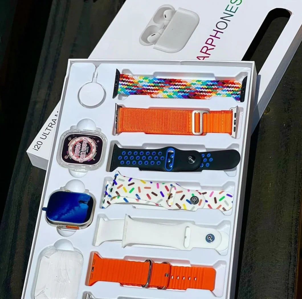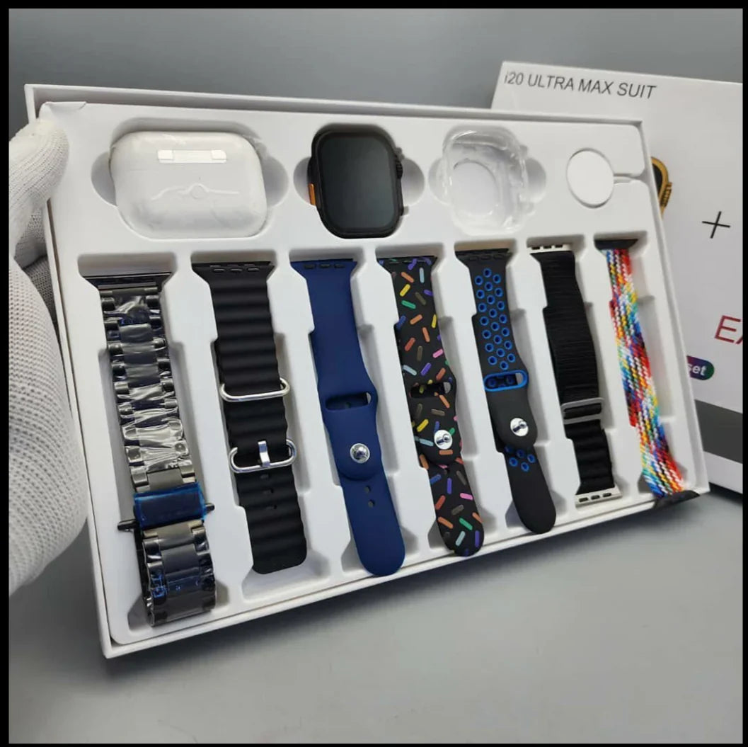 Elevate your tech-savvy lifestyle with the I20 Ultra Max Suit—a complete smartwatch ensemble in one box. Unleash the power of a 2.3-inch large screen accompanied by seven stylish interchangeable straps, ensuring versatility for any occasion. This comprehensive 10-in-1 set comes with Airpods2 for an immersive audio experience. With an IP67 waterproof rating, advanced touchscreen technology, and features like fitness tracking, heart rate monitoring, and remote control functionality, this smartwatch is a technological marvel. Its rotatable design, elegant colors, and compatibility with both Android and iOS make it a standout accessory. Experience a new era of smartwatches with Elec Tech—where innovation meets style.